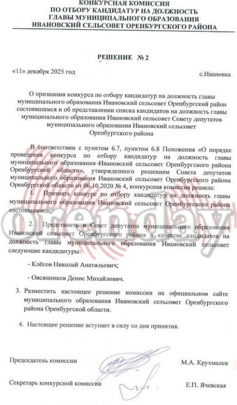 В Оренбургском районе ожидаются выборы еще в одном сельсовете – Ивановском. Конкурсная комиссия уже определила двух кандидатов на пост главы. Это заместитель председателя Совета депутатов Оренбургского района, замдиректора ООО «Уралстрой» Денис Овсянников и индивидуальный предприниматель Николай Клёсов.