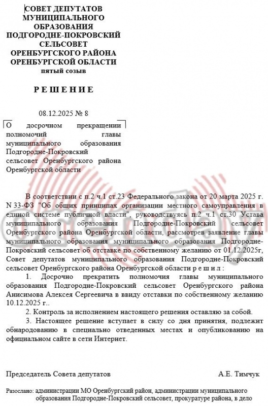 Как стало известно Орендей из собственных источников, не исключена вероятность, что экс-глава Саракташского района Максим Кабанов, покинувший 8 декабря пост после двух лет работы, может вернуться на свою прежнюю должность главы муниципального образования "Подгородне-Покровский сельсовет" Оренбургского района. Предыдущий руководитель сельсовета Алексей Анисимов также ушел в отставку 10 декабря.