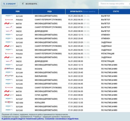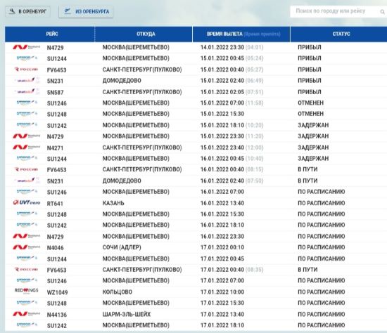 По сообщению Оренбургской транспортной прокуратуры, более 500 пассажиров сегодня ожидали вылеты рейсов в аэропорту Оренбурга. 16 января из-за неблагоприятных метеоусловий (снега и метели) в аэропорту Оренбурга было существенно задержано четыре регулярных авиарейса: два рейса авиакомпании «Аэрофлот» по маршруту Оренбург - Москва (Шереметьево), рейс авиакомпании «NordWind» по маршруту Оренбург - Санкт-Петербург и рейс авиакомпании «NordWind» по маршруту Оренбург - Москва (Шереметьево). В аэропорту для пассажиров была организована мобильная приемная, куда они могли пожаловаться на нарушение их прав.