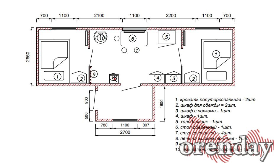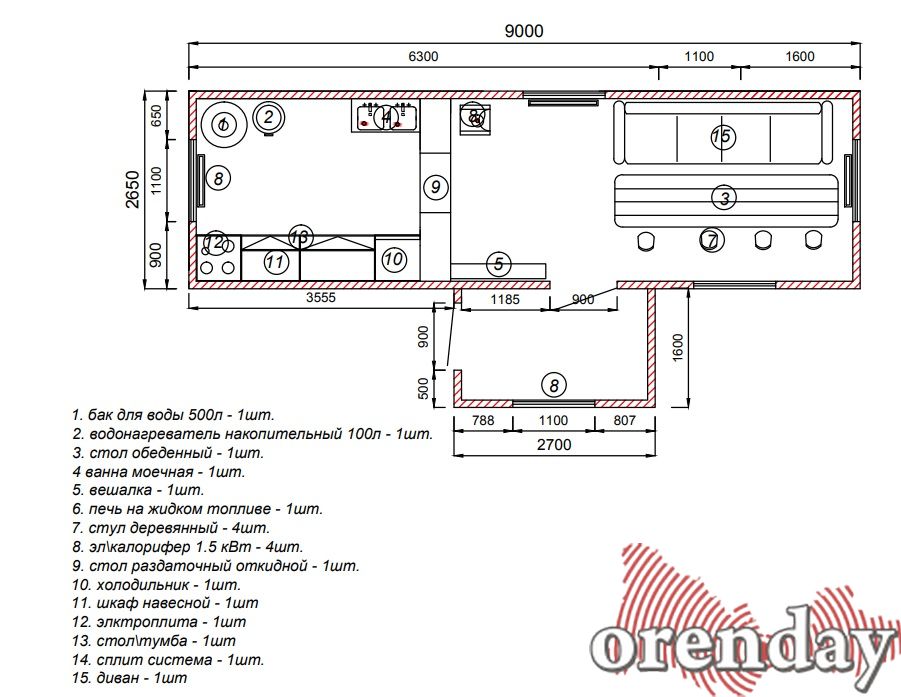 К вашим услугам вешалки, откидной шкаф, тумба – есть, куда девать одежду. Помыться? Пожалуйста! Бак для воды на 500 литров, накопительный водонагреватель и даже моечная ванна. Поесть? Не вопрос! Есть обеденный стол, откидной стол, четыре стула, печь на жидком топливе. Отдохнуть? К вашим услугам диван, а в одной из «элитных» версий «мобильного здания» (да, они различаются по комплектации) - и кровати-«полуторки» вместе с парой шкафов и полками. Также предусмотрены четыре электрокалорифера на 1,5 кВт и сплит-система, и умывальник с подогревом.