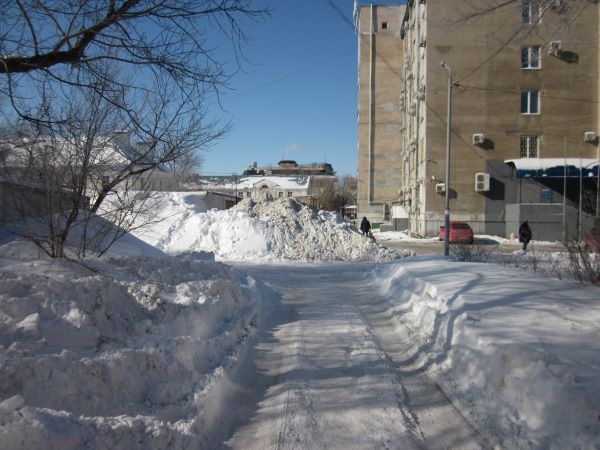 Огромная куча снега высится прямо на въезде во двор многоэтажки в начале улицы Богдана Хмельницкого областного центра, так что выход из него на данный момент заблокирован. Случись ЧП, сюда не сможет проехать даже пожарная машина, так как куча "нарисовалась" после снегоуборки прямо посреди дороги. Видимо, управляющая компания жилищным фондом «Южная», которая обслуживает данный дом, сгребла его с дороги, а вывезет в лучшие времена.