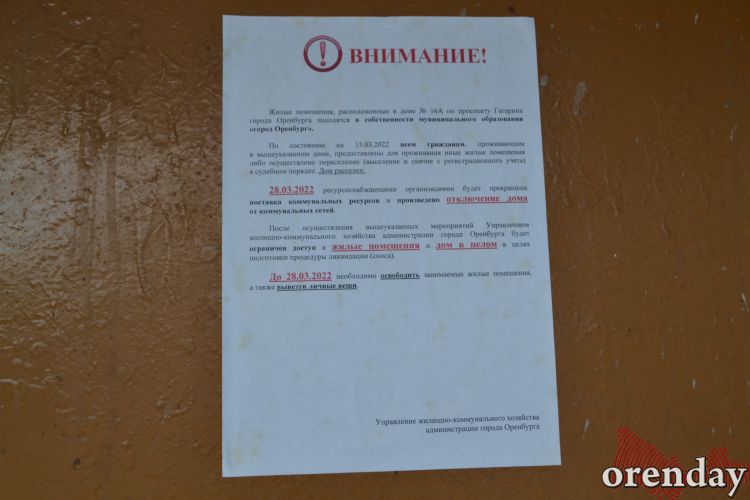 Как значится в объявлении от УЖКХ города, вывешенном на доме по проспекту Гагарина, 16а, данные жилые помещения находятся в собственности города. 15 марта всем гражданам, проживающим ранее в этом доме, были предоставлены другие жилые помещения либо осуществлено их выселение и снятие с регистрационного учета в судебном порядке. 28 марта ресурсоснабжающие организации должны были прекратить поставку коммунальных ресурсов и отключить дом от коммунальных сетей, ограничив доступ в него в целях подготовки к сносу, так что гражданам рекомендовали до этого срока освободить занимаемые помещения и вывезти из них все личные вещи. По факту отключение случилось почти на месяц позже, но случилось.