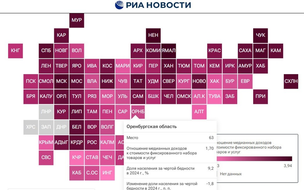 В прошлом году отношение медианных доходов к стоимости фиксированного набора товаров и услуг в Оренбургской области составило 1,70. В регионе доля населения, находящегося за чертой бедности, которые имеют среднедушевые доходы ниже официальной границы бедности, равнялась 9,2 процента, она сократилась всего на 1,8 процентных пункта в годовом выражении. Это ли не печально? Таким образом из 85 регионов Оренбуржье заняло 63 позицию.
