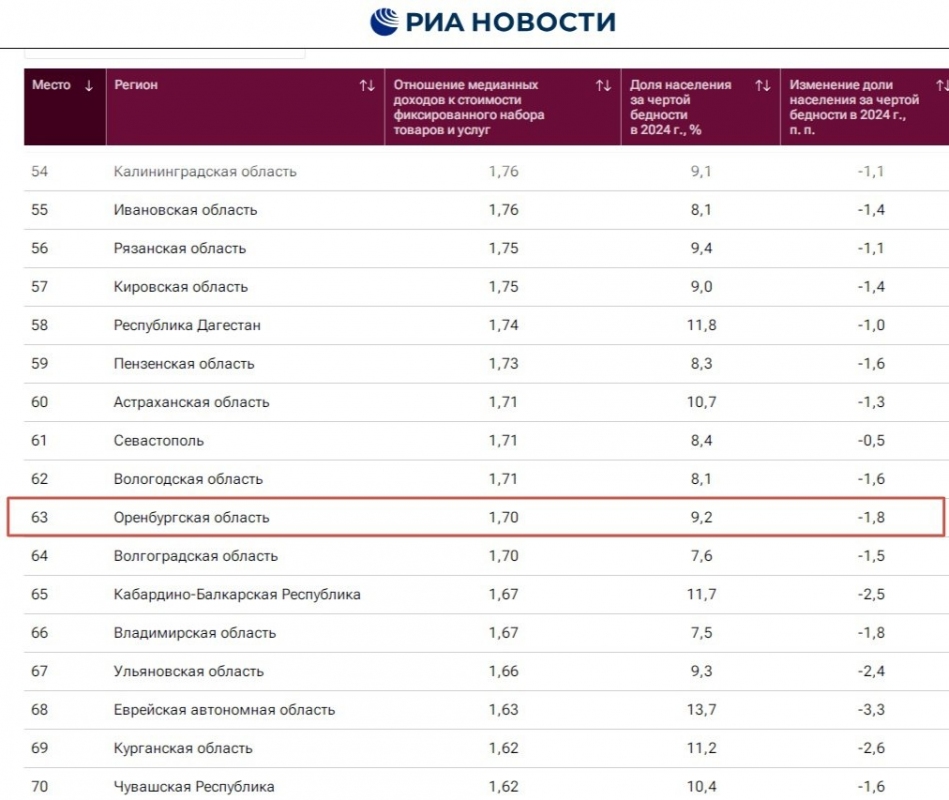 Хуже, чем в Оренбургской области, обстоят дела у Республики Ингушетия, замыкающей список рейтинга. Несмотря на то, что отношение медианных доходов и фиксированного потребительского набора составляет 1,13, доля населения, находящегося за чертой бедности составила 25,6 процентов.