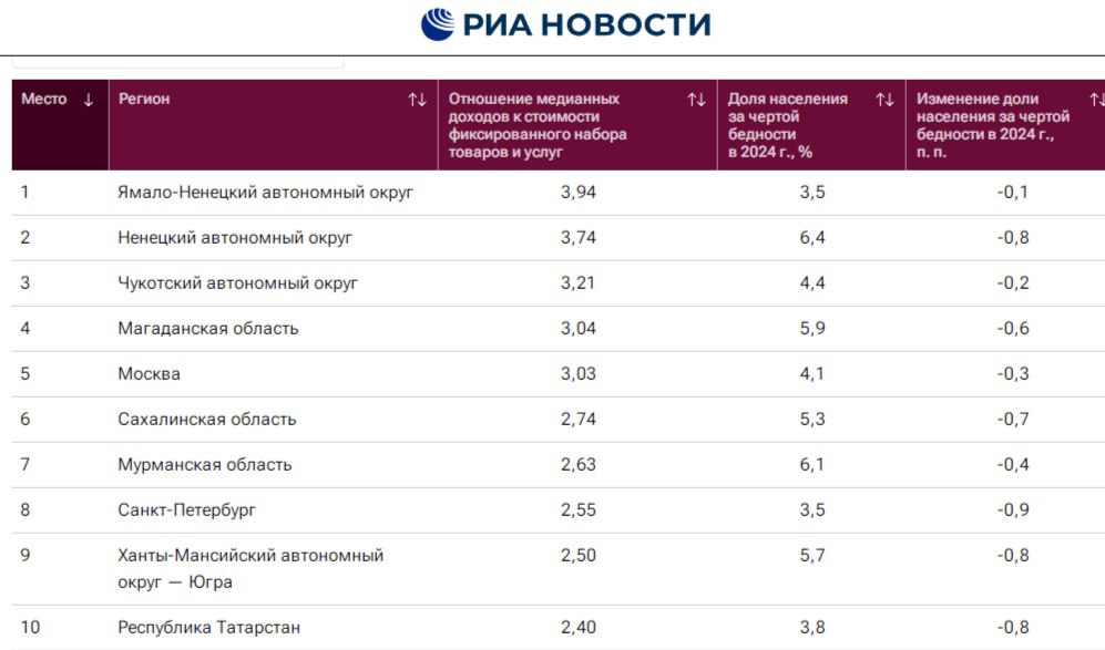 Пятерку лидеров возглавили Ямало-Ненецкий автономный округ, Ненецкий автономный округ, Чукотский автономный округ, Магаданская область и Москва. Санкт-Петербург занял восьмое место, а Республика Татарстан – десятое.