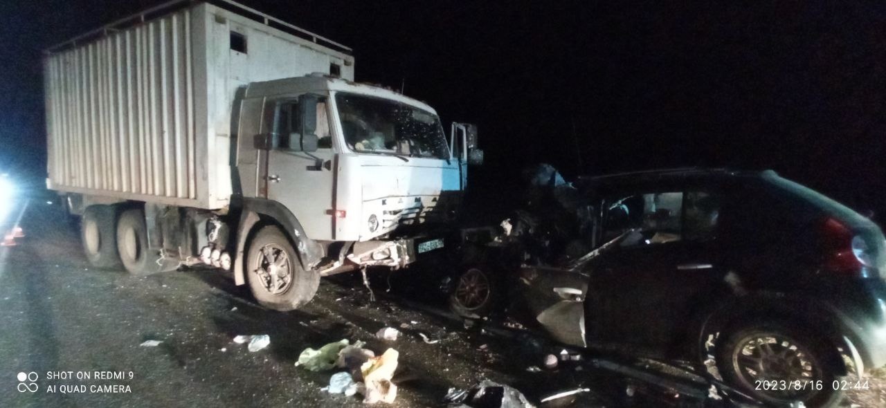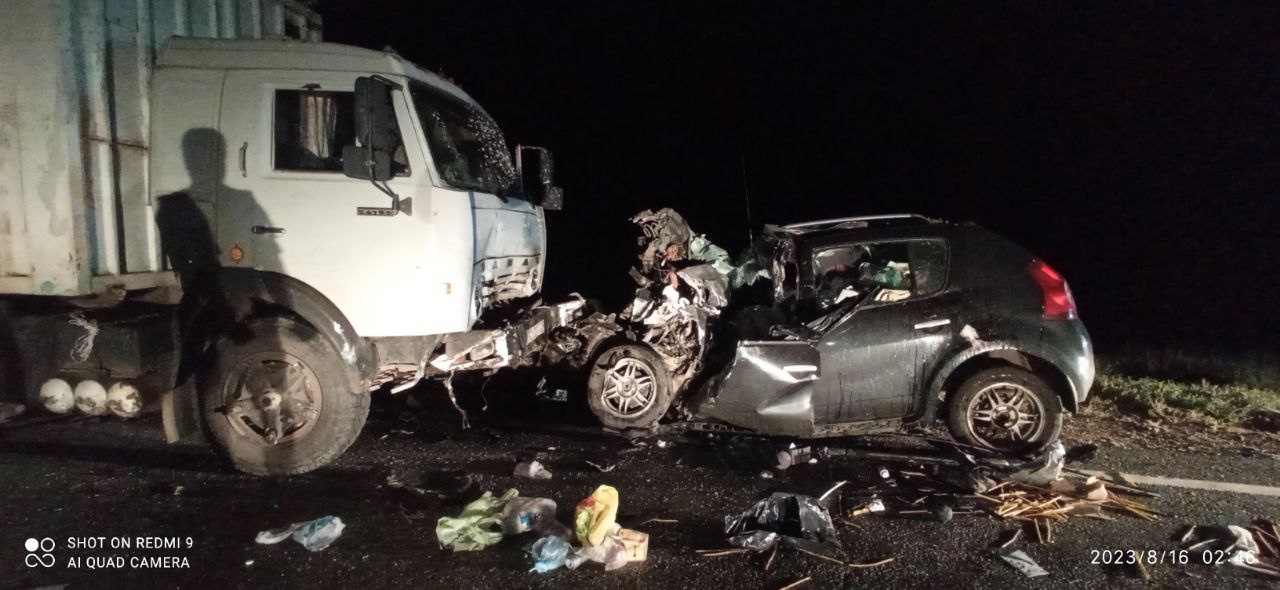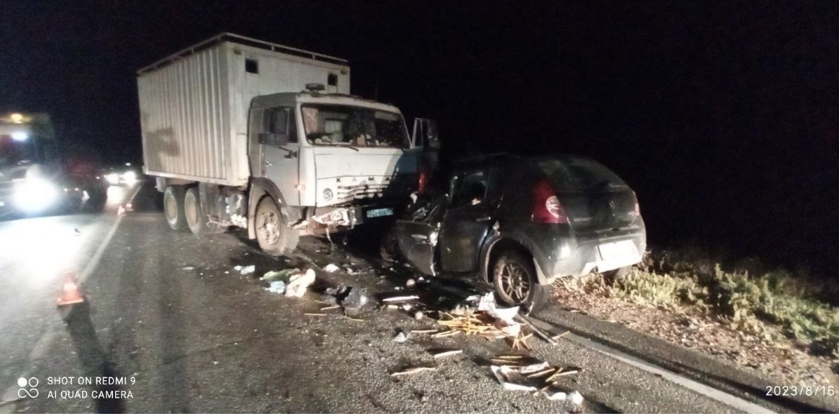 В районе села Белозерка произошло лобовое столкновение автомобилей «Рено Сандеро» и КамАЗ.