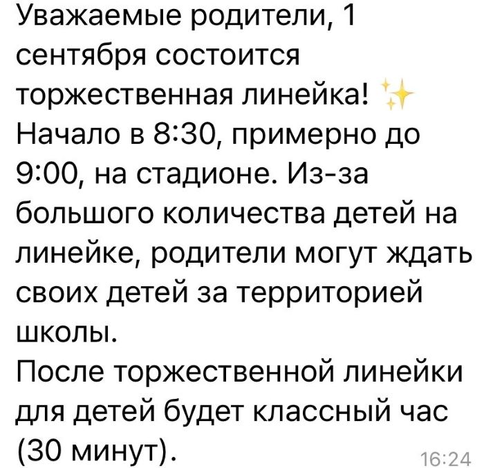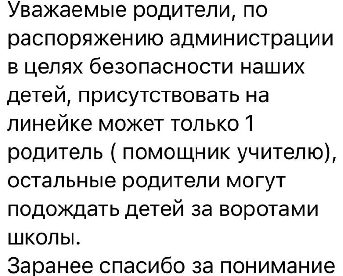 Это как так? Ребенок идет в первый класс, особенное семейное событие, настоящий праздник, и вдруг нас лишают возможности быть рядом с нашими детьми в столь важный и ответственный момент, каких в жизни бывает немного. Такого вообще никогда не было! Это же вчерашние детсадовцы, которые впервые окажутся в незнакомой обстановке одни, а вдруг ребенок испугается, расплачется. Сделайте несколько "линеек", разделите учащихся, чтобы было меньше народу. Можно же найти выход. Но, видимо, красиво выглядеть перед гостями важнее, чем дети с их родителями, - недоумевают родители первоклашек и просят городское управление образования "провести беседу" с руководством новой школы, чтобы директор позволил мамам и папам присутствовать на "линейке" 1 сентября.