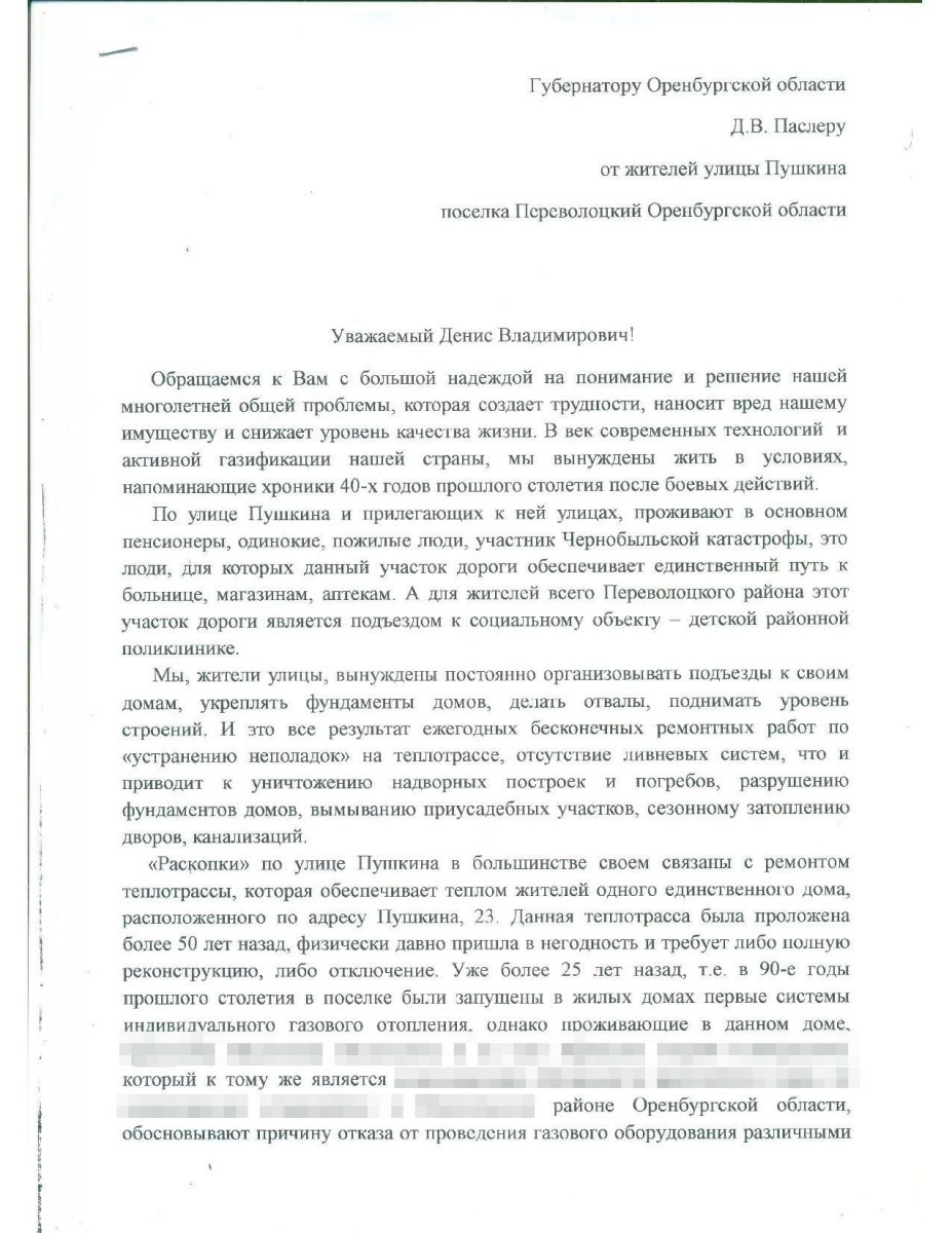 Со стороны главы Переволоцкого поссовета, депутатов и жителей улицы были многократные попытки найти взаимопонимание и уговорить жительницу дома на Пушкинской перейти на автономное отопление, в том числе и за счет бюджета поссовета. Женщине предлагали помощь и содействие во всех инстанциях, но увы… По сей день улицу перекапывают из-за аварий на теплотрассе, что не позволяет привести дорожное полотно в надлежащий вид.