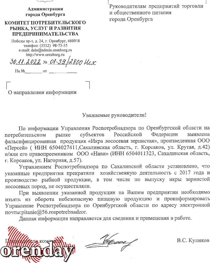 И это еще не всё: теперь к руководителям предприятий торговли и общественного притания Оренбурга обратился Комитет потребительского рынка, услуг и развития предпринимательства мэрии. Там сообщили, что Управление Роспотребнадзора уже выявило в городе ту самую икру зернистую лососевую, производителем которой указан ООО «Персей». Также найдены банки икорки с производителем-правопреемником ООО «Нива». Установлено, что эти предприятия прекратили хозяйственную деятельность еще в 2017 году. Производство рыбной продукции, в том числе и икры, они, логично, не осуществляли.