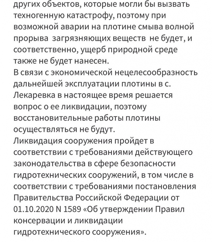 В связи с экономической нецелесообразностью дальнейшей эксплуатации плотины в селе Лекаревка, - говорится в сообщении, - решается вопрос о ее ликвидации, поэтому восстановительные работы осуществляться не будут.