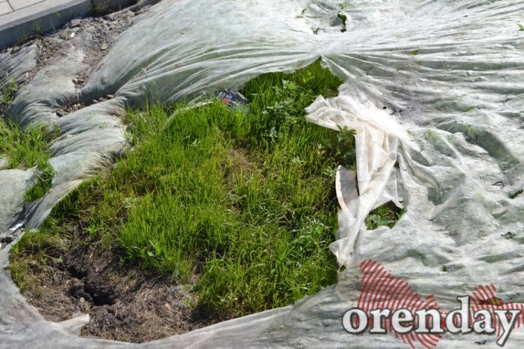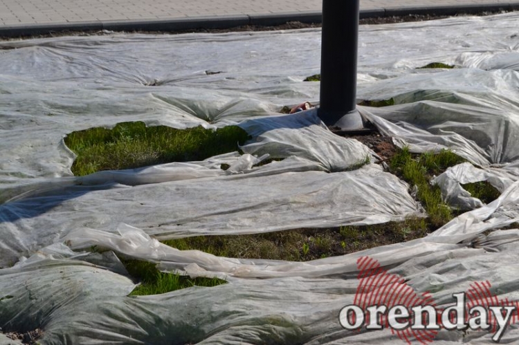 Еще месяц назад на набережной в районе автомобильного моста начали готовить газон. Участок распахали, засеяли и укрыли тканью в начале апреля. Так что же мы видим сейчас?