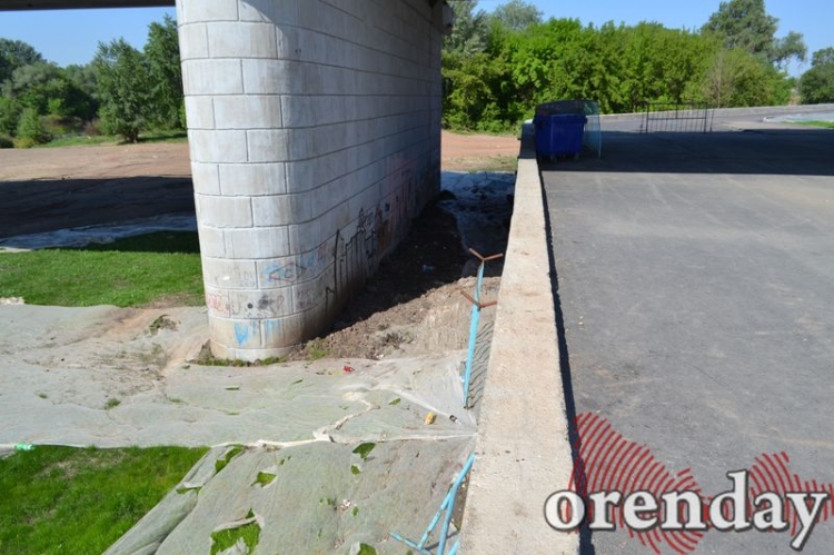 Сверху - мусор (бутылки, окурки, бумажки, кирпичи, камни) валяющийся прямо на спанбонде, несмотря на то, что контейнеры здесь в трех шагах от участка, да ограждения. О них можно сказать отдельно. Изначально «шлагбаум» был установлен прямо под мостом. Сейчас в этом месте остался ровно один кусочек от ограждения. Остальные валяются где ни попадя.