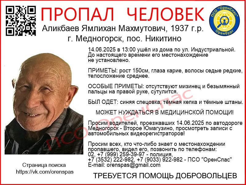 Если вы видели мужчину, позвоните по телефонам: 02, +7 (999) 259-39-97 — полиция, +7 (3532) 222-982, +7 (9033) 922-982 — ПСО "ОренСпас".