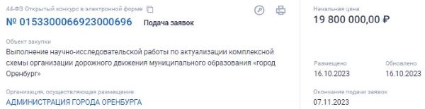 Департамент градостроительства и земельных отношений мэрии Оренбурга ищет подрядчика для выполнения научно-исследовательской работы по актуализации комплексной схемы организации дорожного движения в городе Оренбурге. Заявки от желающих взяться за этот труд принимают до 7 ноября. На эти цели из казны областного центра готовы потратить 19,8 миллиона рублей (6,3 миллиона - в 2023 году и 13,5 миллиона рублей - в 2024-м). Выполнить работу следует до 1 августа 2024 года с учетом ее согласования. Гарантийный срок на выполненные работы составляет 12 месяцев с момента полного исполнения обязательств по контракту.