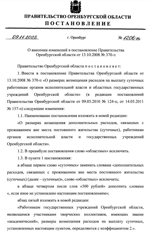 Губернатор внес соответствующие изменения в постановление правительства Оренбургской области от 2008 года "О размерах возмещения расходов на выплату суточных работникам органов исполнительной власти и областных госучреждений". Само постановление теперь носит новое название "О размере возмещения дополнительных расходов, связанных с проживанием вне места постоянного жительства (суточных), работникам органов исполнительной власти и государственных учреждений Оренбургской области".