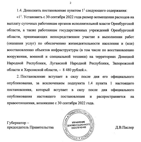 Но главное изменение, которое начало действовать для региональных чиновников и работников госучреждений с 30 сентября текущего года, касается выездов для оказания помощи освобожденным территориям Украины. Так размер суточных работникам органов исполнительной власти, а также госучреждений, принимающим непосредственное участие в выполнении работ (оказании услуг) по обеспечению жизнедеятельности населения или восстановлению объектов инфраструктуры (в том числе по восстановлению вооружения, военной и спецтехники) на территории ДНР, ЛНР, Запорожской и Херсонской областей, составляет теперь 8480 рублей.