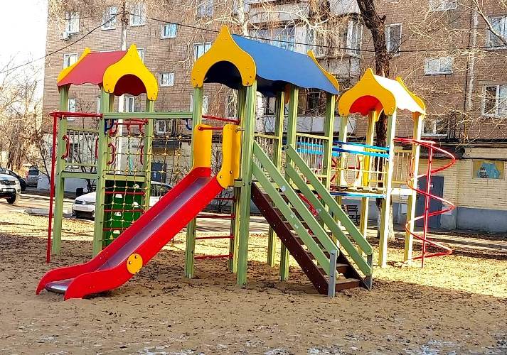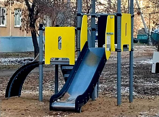Детская площадка у домов № 104 и №106 была дополнена объектами по запросу местных жителей. Около дома № 104 появились новенькие тренажеры, качели, горка, а возле дома № 106 - большой детский комплекс с песочницей, качелями-скамейкой и другие игровые снаряды.