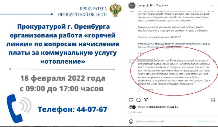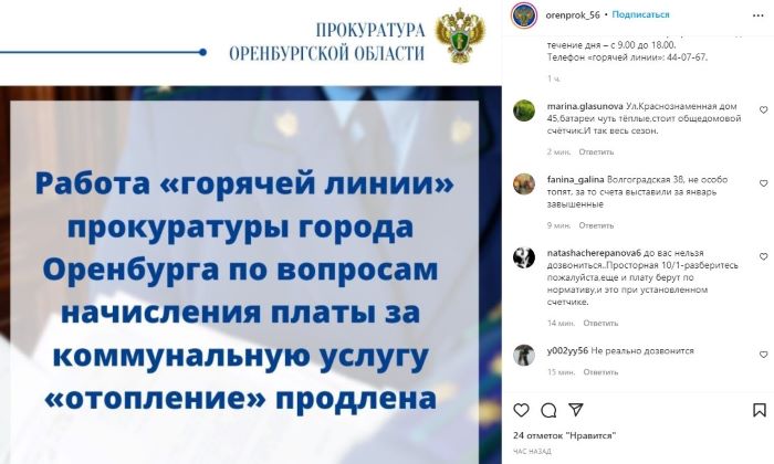 Так что жителей Оренбурга, если они не смогли дозвониться, попросили оставлять сообщение со своими контактными данными на странице прокуратуры Оренбургской области в Инстаграме, хотя для пенсионеров, более всего возмущенных счетами, такое предложение совсем не выход. Сотрудники потом обязательно свяжутся со всеми обратившимися и обещают проверить начисления по каждому указанному адресу. О принятии конкретных мер пока говорить рано.