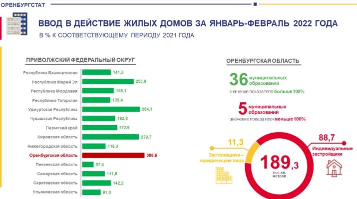 Всего в этом году уже построено 1071 жилой дом, из которых 1067 домов были возведены самими жителями. В многоэтажках же сданы с начала года 1503 квартиры. Население в этом году строится в 4,2 раза активнее начала года предыдущего. По темпу ввода в эксплуатацию жилых домов в январе-феврале 2022 года Оренбуржье занимает первое место в ПФО.