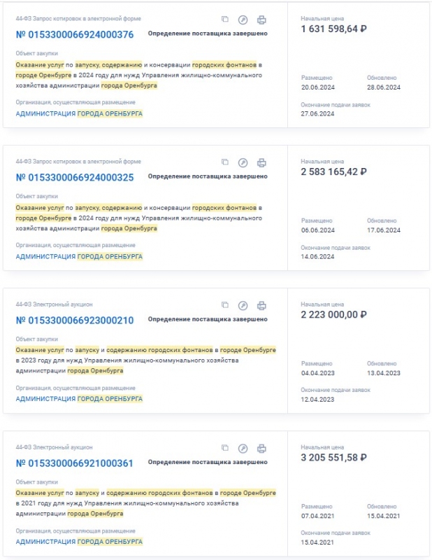 Лишь 6 июня УЖКХ администрации города объявило электронные торги на оказание услуг по запуску, содержанию и консервации городских фонтанов, а 20 июня был заключен контракт с ООО «Оренбург Водоканал» на 2 583 165 рублей. Под крыло компании тогда отдали лишь 10 городских фонтанов, а позже отыграли еще один лот на 1 631 598 рублей, куда вошли еще 6 фонтанов.
