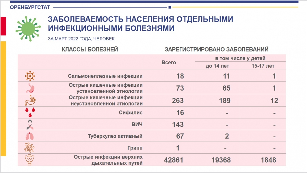 В январе 2022 года сифилис выявили у 15 человек. Благо, ни дети, ни подростки в это число не вошли. ВИЧ, по данным Оренбургстата, обнаружили у 109 человек (ни одного больного среди детей и подростков также нет).