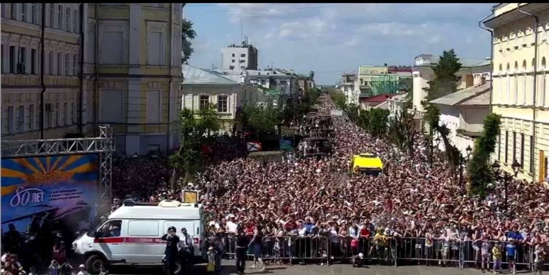 Людей пригласили на набережную, но попасть на нее было нельзя, ее перекрыли для проведения официальной части мероприятия. Пришлось людям стоять затылок в затылок между зданиями летного училища и медицинского университета. Не было даже элементарного - воды, которую можно было бы купить поблизости, ее вмиг раскупили. А на улице стояла невыносимая жара.