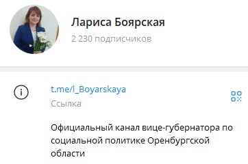 Начнём наш обзор с тг-канала Ларисы Боярской, которая вещает о социальной политике Оренбуржья. На просторах интернета канал появился относительно недавно (8 июля) и насчитывает уже более 2000 подписчиков. С момента создания Лариса Александровна уже выложила несколько постов, которые набирают неплохое количество реакций и активно обсуждаются в комментариях, которые, кстати, говоря, открыты. https://t.me/l_Boyarskaya