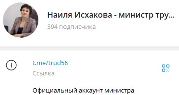 О занятости населения рассказывает нам Наиля Исхакова, которая ведет свой тг-канал с далёкого 2022 года. Подписчиков немного - всего 394 человека. Канал практически не ведётся, хоть сейчас и появилось больше постов, но там лишь освещают ключевые моменты деятельности чиновницы. https://t.me/trud56