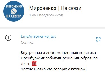 Отличился по-своему и Юрий Мироненко с тг-каналом «Мироненко | На связи», где он активно просвещает оренбуржцев о работе муниципалитета и информационной политике. Юрий Александрович ведёт свой канал с блогерской подачей. «Я планирую делать это без официоза, по существу и максимально честно». Он рассказывает о делах просто, поэтому складывается впечатление дружеского общения. В комментариях можно заметить сильную динамику, где подписчики обсуждают что-то между собой, а также получают обратную связь от Юрия Мироненко. Сейчас на тг-канал «Мироненко | На связи» подписаны примерно 1500 человек, но и это далеко не предел. https://t.me/mironenko_tut
