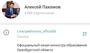 Алексей Пахомов также создал свой тг-канал, где рассказывает о своей деятельности в сфере образования. Канал насчитывает рекордное, среди других, количество подписчиков - почти 4 700 человек. Алексей Александрович выложил всего 2 поста, однако, динамика наблюдается даже больше, чем у других. В комментариях жители области активно обсуждают темы, касающиеся образования. Также часто наблюдается обратная связь. https://t.me/pakhomov_official56