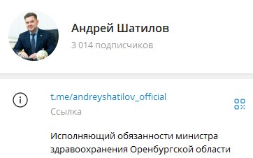Андрей Шатилов также создал свой тг-канал, в котором вещает о здравоохранении. На него подписаны около 3000 человек, хоть они и проявляют меньше активности, чем в других каналах. https://t.me/andreyshatilov_official