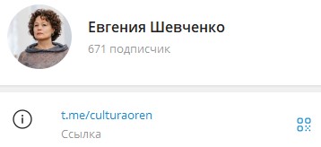 Евгения Шевченко подошла к созданию тг-канала с особым энтузиазмом. Хоть канал пока и насчитывает 671 подписчик, но это не мешает людям активно ставить реакции и комментировать посты. Евгения Валерьевна открыто и доступно освещает новости культуры, а также использует молодёжный сленг, который заходит аудитории. Особенно подписчикам полюбилась публикация с подписью «Красивое…». https://t.me/culturaoren