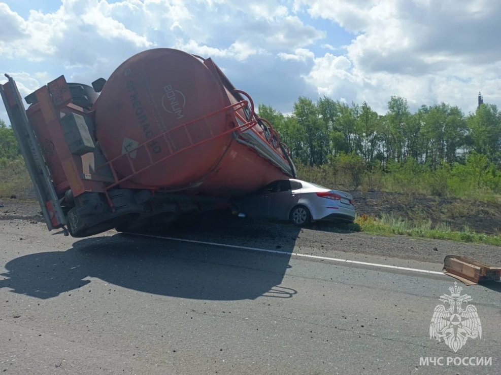 На трассе столкнулись большегруз, легковой автомобиль и бензовоз.