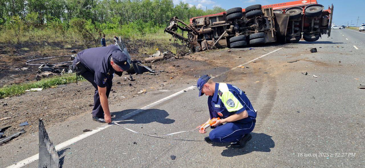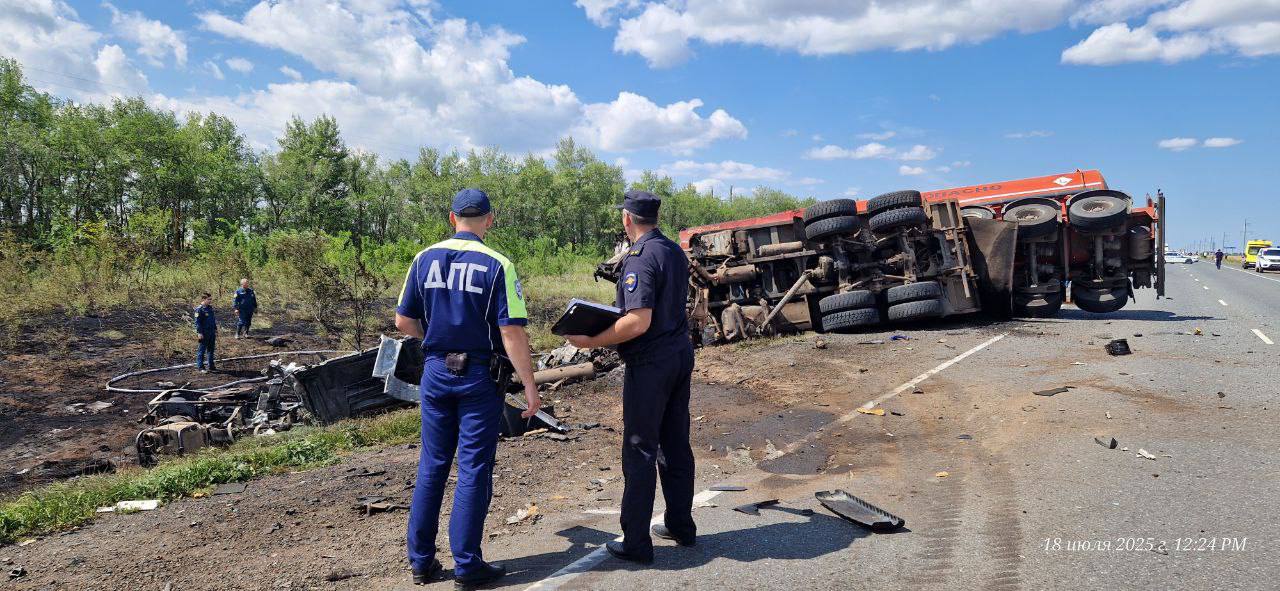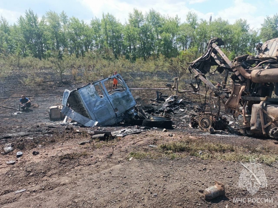 В результате столкновения произошло возгорание в грузовом автомобиле. Огонь перекинулся на кабину бензовоза и сухую растительность.