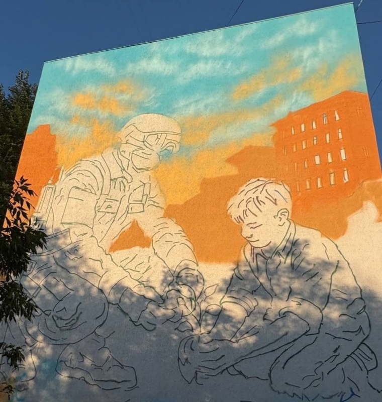 Его автор — Андрей Корниенко, молодой художник. В работе ему помогает Всеволод Сурма. Роспись изображает трогательную сцену: солдат вместе с ребенком сажают дерево, символизирующее мир, память и надежду на будущее. Как поясняет автор, граффити отражает передачу ценностей между поколениями и идею продолжения жизни.