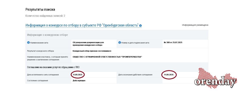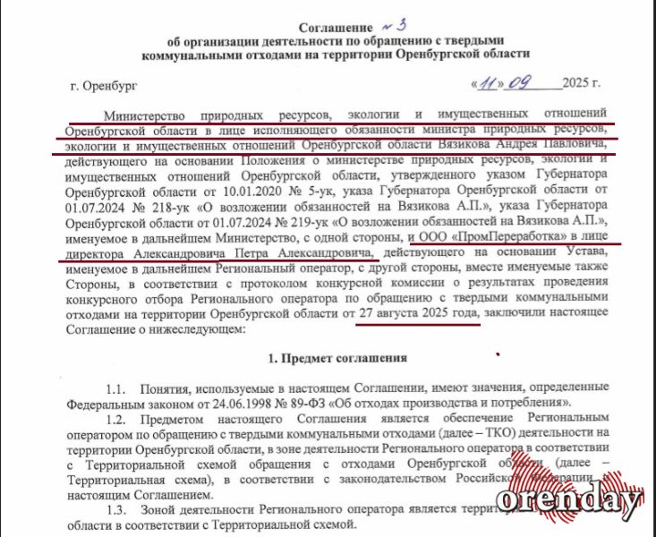 11 сентября 2025 года министерство природных ресурсов, экологии и имущественных отношений Оренбургской области заключило соглашение с ООО «ПромПереработка» об оказании услуг по обращению с ТКО. Конкурсный отбор прошёл, как Orenday уже рассказывал, «тихой сапой» на фоне практически ежедневных жалоб в соцсетях первому лицу региона на состояние площадок ТКО.