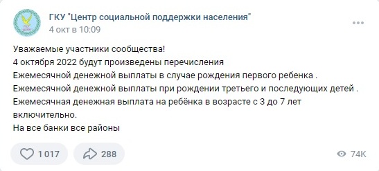Никаких нарушений нет, выплаты начисляются с 1 по 30 число каждого месяца. Сегодня, 18 ноября, денег не будет. Отслеживайте информацию в социальной сети в нашей официальной группе. Там появится пост о начислениях, - сообщили здесь.