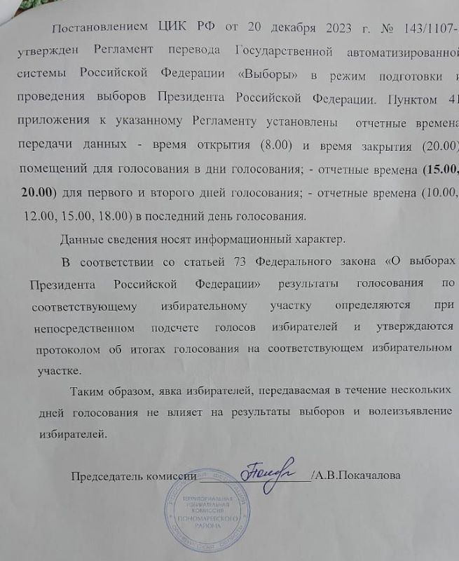 Ответ на это заявление поражает, получается, что отчет по явке может быть каким угодно, он же носит информативный характер и не влияет на общий исход голосования.