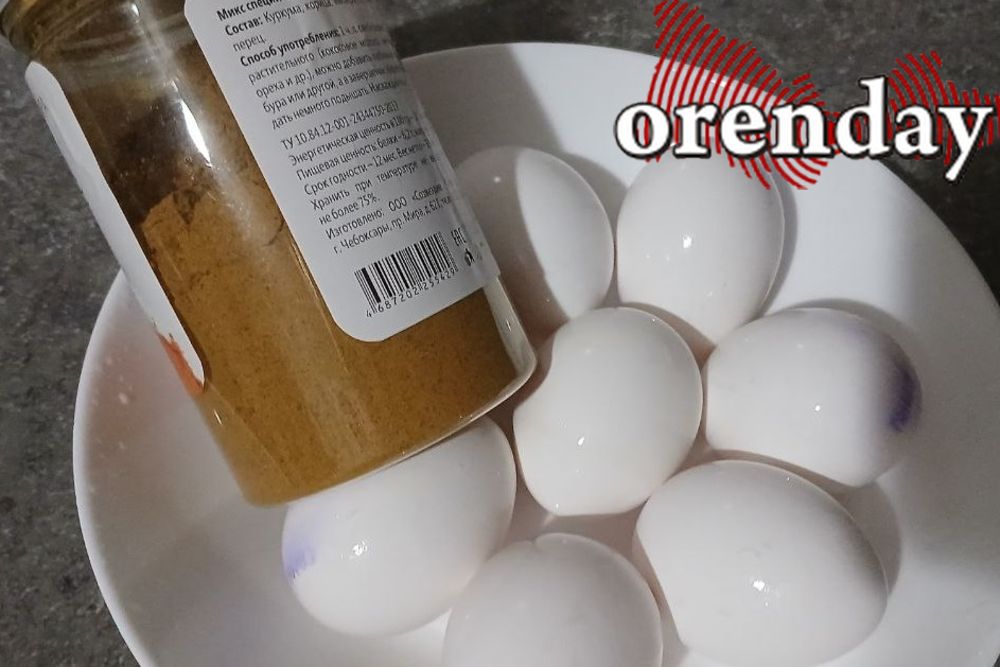 На 2 литра воды всыпается 5 столовых ложек куркумы, 2 чайные ложки соли. Вода доводится до кипения. Варить 10-15 минут. Достать яйцо из кастрюли и промыть холодной водой.