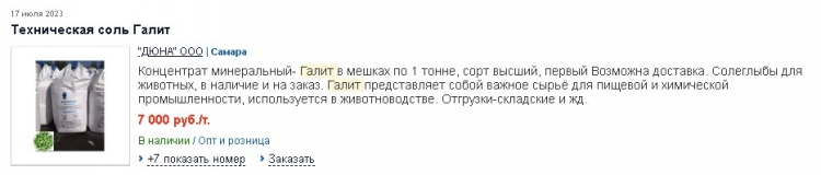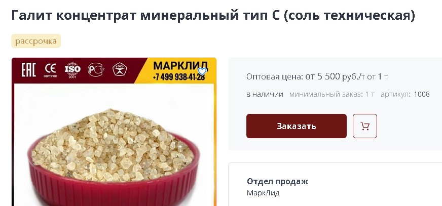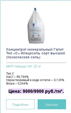 А вот если заказывать через московскую фирму продукцию «Руссоли», добытую в Соль-Илецке, то цена за тонну выше чуть ли не в два раза – от 9 000 до 9 900 рублей за тонну.