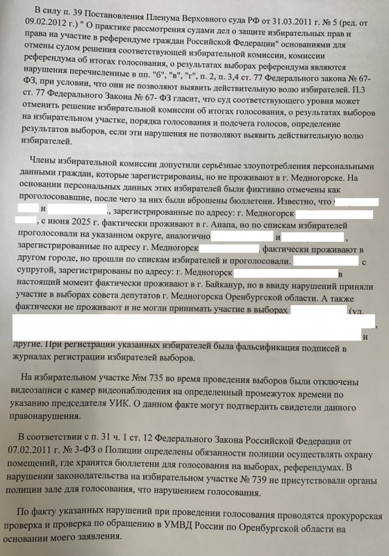Более того - подан иск в суд с требованием признать незаконными и отменить решения избирательной комиссии об итогах голосования на двух избирательных участках: №№739 и 742.