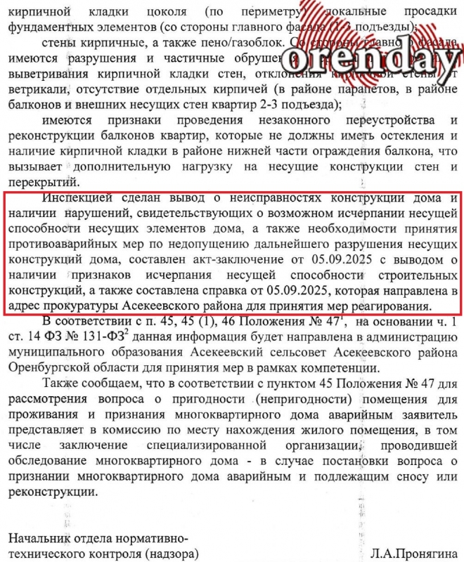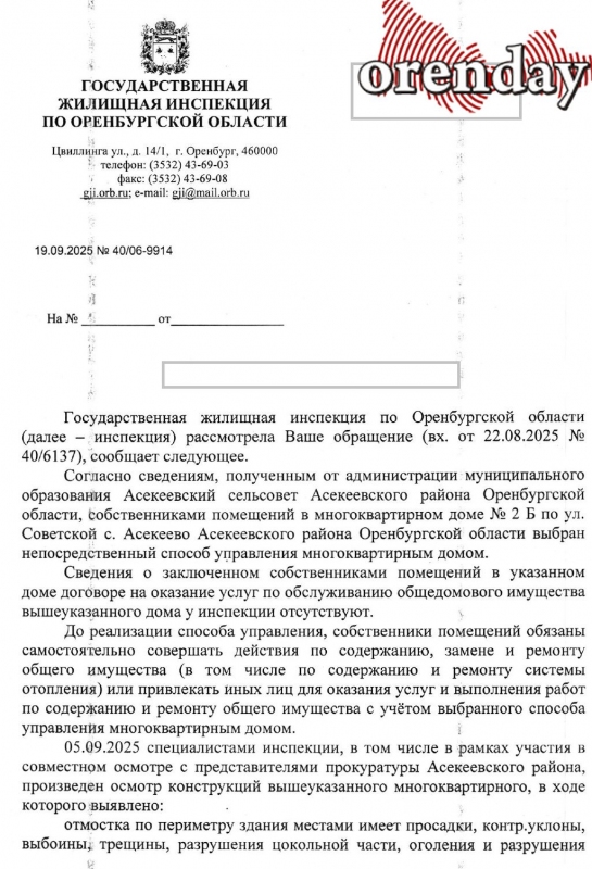 Специалисты государственной жилищной инспекции Оренбургской области совместно с прокуратурой Асекеевского района осмотрели здание. В акте, подписанном начальником отдела нормативно-технического контроля, зафиксировано: