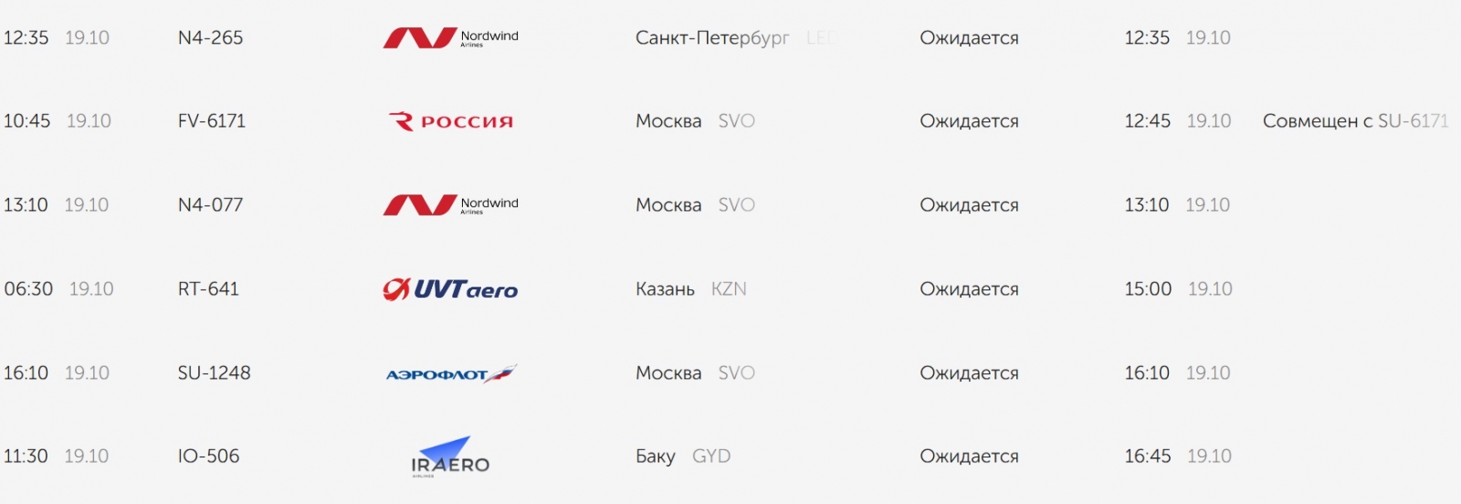 Сдвинулось и время прибытия рейсов. Электронное табло гласит, что прибытие борта из Москвы ожидается в 12.45 (должен был приземлиться в 10.45), из Казани – в 15.00 (было запланировано на 6.30), из Баку – в 16.45 (изначально предполагалось, что он прибудет в 11.30).