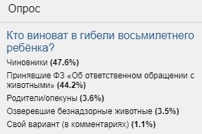 Читатели Orenday, отвечая на наш вопрос, кто же виноват в гибели второклассника, по больше части, а таких почти 48 процентов, уверены, что виноваты чиновники, которые должным образом не соблюдали требования закона - не построили приют, не выделяют достаточно средств на заключение контрактов по отлову, стерилизации и содержанию в приютах безнадзорных животных. Вторая весомая часть респондентов - 44 процента от принявших участие в опросе - винят во всем тех, кто принимал федеральный закон "Об ответственном обращении с животными". Примерно 3,5 процента опрошенных считают, что виноваты родители, которые отпустили 8-летнего мальчика гулять одного, и столько же перекладывают всю ответственность за случившееся на самих озверевших безнадзорных псин.