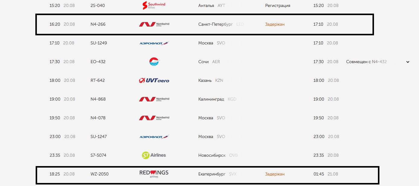В Оренбурге аэропорт имени Гагарина сообщает о задержке рейса в Санкт-Петербург. Борт в северную столицу должен был вылететь в 16.20 по местному времени, но вылет перенесли на 17.10. Еще один рейс задержан в Екатеринбург. По расписанию он должен был вылететь в 18.25 минут, но теперь время вылета перенесено на 01:45.