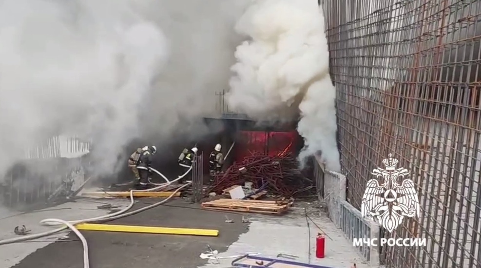 В Новотроицке клубы черного дыма вырываются со стройплощадки по улице Советской. На цокольном этаже произошло возгорание строительных материалов.