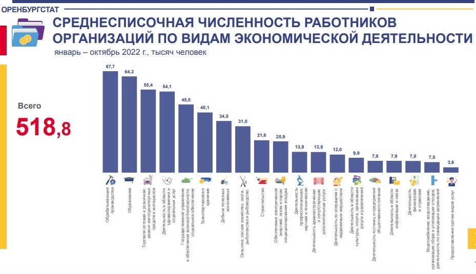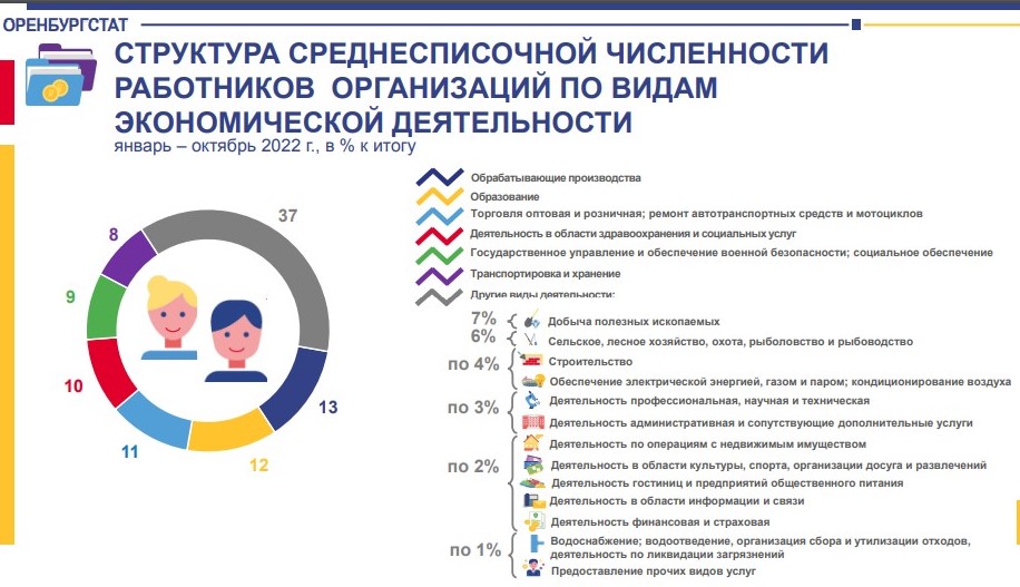 Больше же всего оренбуржцев трудятся сегодня в обрабатывающих производствах, образовании, торговле, здравоохранении и государственном управлении.