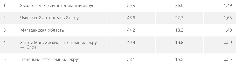 Лидером рейтинга стал Ямало-Ненецкий автономный округ с результатом 56,9%. Высокий результат этого региона является следствием высоких зарплат, считают эксперты. Также в число лидеров попали Чукотка и Магаданская область с результатами 48,9% и 44,2%. Тут тоже высокие зарплаты, однако стоимость жизни заметно выше, что и определило отставание от ЯНАО. Также в первую пятерку попали Ханты-Мансийский автономный округ (40,4%) и Ненецкий автономный округ (38,1%).