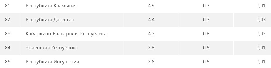 На последней строчке рейтинга расположилась Ингушетия, где лишь 2,6% семей могут позволить себе приобрести новый автомобиль за 900 тысяч рублей. Также в числе регионов, замыкающих рейтинг: Чечня (2,8%), Кабардино-Балкария (4,3%), Дагестан (4,4%) и Калмыкия (4,9%).