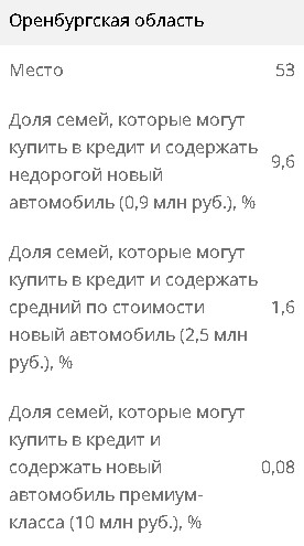 Оренбургская область расположилась на 53 месте в рейтинге. Доля семей, которые могут себе купить в кредит и содержать новый недорогой автомобиль (до 900 тысяч рублей) в нашем регионе составила 9,6%. Средний по стоимости автомобиль (до 2,5 млн. рублей) "по карману" 1,6 % оренбургских семей, а авто премиум-класса (порядкаа 10 млн. рублей) - 0,08 % семей.